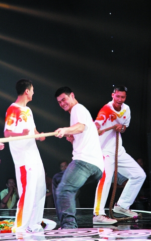 林浩向姚明挑戰(zhàn)拔河。林班長身后站著四個(gè)孩童,而繩索另一端,是姚明和易建聯(lián)。5個(gè)孩子用盡全力,不敵兩位籃球“巨人”,頑童隊(duì)伍增加到8人,“姚易”手中繩索仍紋絲不動(dòng)。再增至15人,姚易終于敗下陣來,“汗都下來了”姚明擦著額頭。而孩子們則歡呼“團(tuán)結(jié)力量大”。