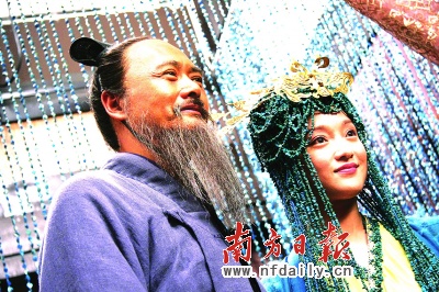 昨天下午5時(shí)左右,在涿州影視城戰(zhàn)國(guó)城內(nèi)的一座大殿里,“子見南子”的戲正式上演。幽暗的大廳里擺設(shè)著8座戰(zhàn)國(guó)時(shí)常見的犧尊造型的琉璃紗燈,褐色的紗帳從梁上垂下。而由奚仲文打造的演員服裝更是讓人眼前一亮:扮演孔子的周潤(rùn)發(fā)身穿青灰色麻布長(zhǎng)袍,頭戴同顏色的儒士巾,看起來(lái)極為樸實(shí)。而周迅扮演的南子則一身水藍(lán)色的長(zhǎng)裙,顯得雍容華貴。周迅頭頂?shù)慕鹕P冠和同樣水藍(lán)色的頭飾,據(jù)說(shuō)是由松綠石串成,因此非常沉重。在第一次試戴的時(shí)候,周迅甚至抬不起頭來(lái), 需要有人在后面幫忙才能正常行走。