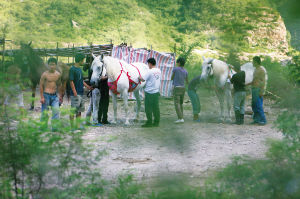 在劇組的馬棚里,記者看到了幾匹純種馬正穿著紅紅綠綠的“肚兜”遛來遛去(小圖),場面相當(dāng)搞笑。這種“肚兜”由一塊鮮艷的花布和4條帶子組成,帶子穿過馬匹的前腿系在它們的背上,正好包裹住馬匹的胸腹部位。大多數(shù)工作人員都不明白這種“馬肚兜”是做什么用的,只說這是導(dǎo)演姜文的主意,只有一位工作人員透露說,這種“肚兜”是馬幫的標(biāo)致。記者 楊蓮潔