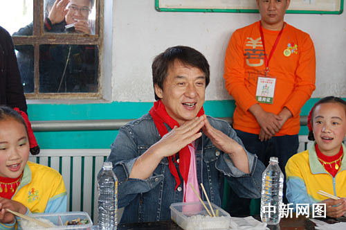 臨近午飯時(shí)分,成龍與十幾名小學(xué)童每人領(lǐng)到了一盒香菇炒油菜和白米飯的盒飯,在一間簡(jiǎn)陋的教室里津津有味地吃了起來。雖然是頭一次與國(guó)際巨星成龍?jiān)谝黄鸪燥,可這些鄉(xiāng)村娃娃卻一點(diǎn)也不怯場(chǎng),好奇心驅(qū)使他們左一個(gè)問題右一個(gè)問題問個(gè)不完。而成龍卻面帶笑容地邊吃邊聊,將他的成長(zhǎng)經(jīng)歷和成功經(jīng)驗(yàn)?zāi)托牡匾灰唤獯。眾學(xué)童聽完后,紛紛夸“成龍叔叔好棒啊!”