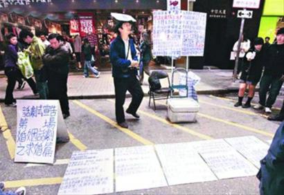 日前,在旺角行人專用區(qū),一位中年男子在頭上圍上“我愛容祖兒公主”的紙牌,帶著紅白藍(lán)膠袋、兩張折椅等做道具,當(dāng)街展示多張求愛紙牌。