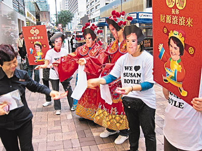 至于香港的蘇珊大媽粉絲也不甘示弱,近日戴起面具兼穿上“愛(ài)珊Tee”向途人大派“蘇珊財(cái)神”,代偶像祝港人今年財(cái)源滾滾。有關(guān)方面也推出了賀年新春限量版CD應(yīng)節(jié),附送蘇珊“心想事成”紅包10個(gè),以配合唱片主題“我有個(gè)夢(mèng)想”。