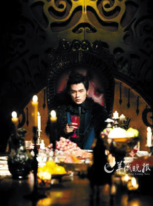 在新專輯預(yù)售海報(bào)上,周杰倫以一個(gè)中古世紀(jì)的吸血鬼扮相出現(xiàn)。只見(jiàn)他臉色蒼白,嘴唇鮮紅,穿一身西裝外套,還罩了一件羽毛披肩,坐在餐桌前若有所思,像是一個(gè)住在城堡中的神秘“吸血鬼王子”。造型師還在周杰倫的指甲貼上帶有鉚釘?shù)闹讣灼,讓握著酒杯的手流露出華麗感;眼睛里則戴上了特殊的隱形眼鏡,營(yíng)造出一雙“電眼”,眼里還有動(dòng)物般的直立橢圓瞳孔,詭異得令人戰(zhàn)栗。