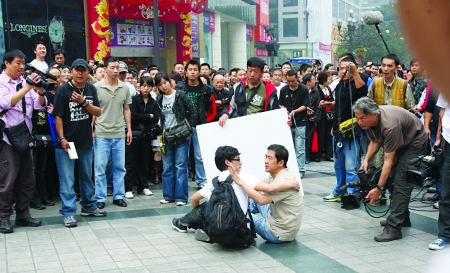 上午10點10分,記者趕到現(xiàn)場時,解放碑下已經(jīng)聚集了數(shù)百群眾,不少人正在熱烈討論:“費力抓到個小偷,結(jié)果是在拍戲嗦。”原來,昨天的戲份是扮演張國立舞蹈老師的韓雨芹正在逛街,錢包被小偷偷了,“暗戀”老師的張國立發(fā)現(xiàn)后,奮勇抓住了小偷。一位工作人員告訴記者,一開始拍攝的是遠景,出場的是身著張國立同樣服裝的替身演員,為求真實,攝影機和工作人員都離得比較遠,現(xiàn)場非常不好控制。記者看到,每當(dāng)替身演員大喊抓小偷時,本該由扮演路人的演員出場一起圍抓小偷,誰知總有不少路人以為真有“小偷”,上百人一擁而上,還有的出手打“小偷”,導(dǎo)演不得不數(shù)次叫停,最后連張國立都上前來營救“小偷”。