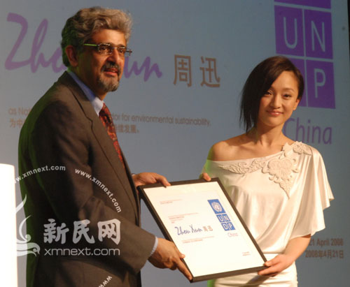 2008年4月22日,新民網(wǎng)記者從周迅經(jīng)紀(jì)公司華誼了解到,周迅被聯(lián)合國(guó)開(kāi)發(fā)計(jì)劃署任命為中國(guó)首位親善大使,將與羅納爾多、齊達(dá)內(nèi)和莎拉波娃等體育明星在各自領(lǐng)域從事慈善、環(huán)保工作。任命儀式上,周迅表示,為了呼吁環(huán)保,她將不再泡澡。