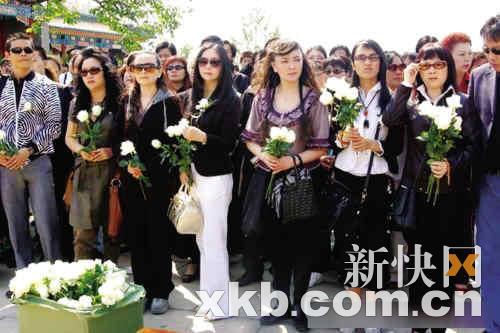 紀(jì)念活動開始時,幾百名陳曉旭的影迷帶著白花,圍繞在陳曉旭的水晶雕像周圍。而現(xiàn)場還專門設(shè)立了兩個祭壇,其中一個是為5月12日四川地震遇難者專門設(shè)置的祭壇。因為陳曉旭生前篤信佛教,還專門為她請來了9位高僧進(jìn)行了簡短的超度儀式。