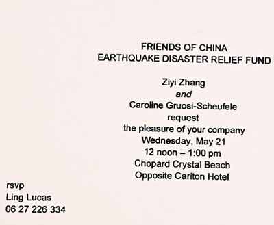 章子怡昨在戛納Tod's派對(duì)上廣發(fā)賑災(zāi)活動(dòng)邀請(qǐng)卡(下圖)。