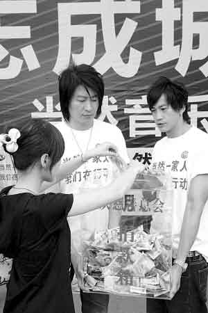 昨天,游鴻明、何潤東、陳怡蓉、沈建宏、鄧寧、劉錫明、阿清、高磊、晨辰等當(dāng)然音樂的歌手抵達(dá)重慶。他們帶著70余萬元的救災(zāi)物資和9顆愛國之心在重慶街頭為汶川地震的災(zāi)后重建募款。在重慶石橋鋪佰騰數(shù)碼廣場、沙坪壩步行街、江北北城天街三個(gè)募捐點(diǎn),累計(jì)3小時(shí)的募款活動中,何潤東等9位藝人共籌集善款187400余元,目前這個(gè)數(shù)字還在不斷增加。