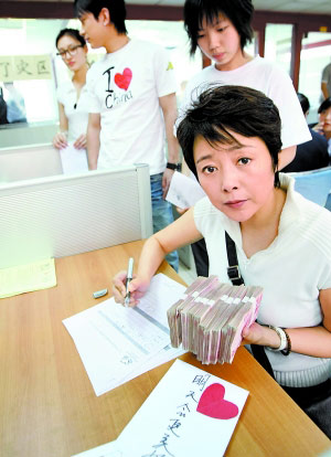 前天,從寧波外景地直接趕回北京的著名演員張瑜,從北京機(jī)場直接來到中國扶貧基金會,為汶川災(zāi)區(qū)的孩子們再捐10萬元善款。和張瑜一道同來的還有張瑜導(dǎo)演的電影《八十一格》的兩位青年主演王麗坤和王睿。張瑜說,10萬元對災(zāi)區(qū)人們來說,也許是杯水車薪,但現(xiàn)在災(zāi)區(qū)孩子需要的不僅僅是錢,他們更需要心靈醫(yī)治和撫慰。
