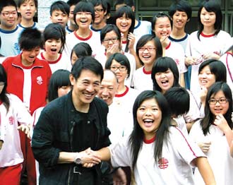 李連杰(左)昨天下午到南投縣集集國(guó)中,與學(xué)生們相見歡。