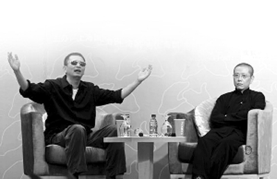 昨天的這個論壇雖是王家衛(wèi)主持,但是他幾乎把所有時間留給陳丹青,自稱自己欽佩陳丹青多年,甘當(dāng)配角。但是陳丹青卻一點也不給他面子。兩位大師一上臺,記者們就紛紛拍照,閃光燈閃成一片。誰料,陳丹青剛跟大家問過好,就指著王家衛(wèi)說:“我是被他綁架來的。”他接著訴苦道,“坐在這臺子上,我不能抽煙。我一不抽煙智商就下降一半。雖然我知道抽煙不好。現(xiàn)在你們還不停拍我,我都快說不出話來了!闭劻艘粫惖で嗤蝗挥謥砹司洌骸敖裉煳液玫姑,先是被綁架來,現(xiàn)在發(fā)現(xiàn)襪子沒穿好,襪子幫太短,我不能把腿蹺著坐,老這樣端端正正地坐著,真累!”