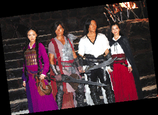 走進(jìn)一間已經(jīng)被布置成刑房的攝影棚,巖石碎塊構(gòu)成了粗糙的地面,幾把劍插成了劍壇,臺階上火爐冒著火苗,空中還懸著幾塊爬著蟲蛆的火腿,幾臺鼓風(fēng)機(jī)正開足馬力吹著風(fēng)……看前面,一堆人正在你推我一把,我攻你一招,原來替身正在幫任達(dá)華試戲。對披著長發(fā)造型的鄭伊健、郭富城以及何家勁來說,炎熱恰是專門跟耍帥作對的。問到郭富城對于造型的看法,郭富城當(dāng)即冒出一句“非常熱”。現(xiàn)場汗流浹背的阿Sa抱怨說,飾演聶風(fēng)的鄭伊健可謂是片中最舒服的一位,不僅戲服相對清涼,由于名為“風(fēng)”,因此拍戲的時(shí)候可以充分享受鼓風(fēng)機(jī)的待遇。