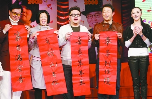 黃百鳴、吳君如、導(dǎo)演谷德昭、郭濤以及姚晨(從左至右)攜《家有喜事2009》為觀眾拜年。