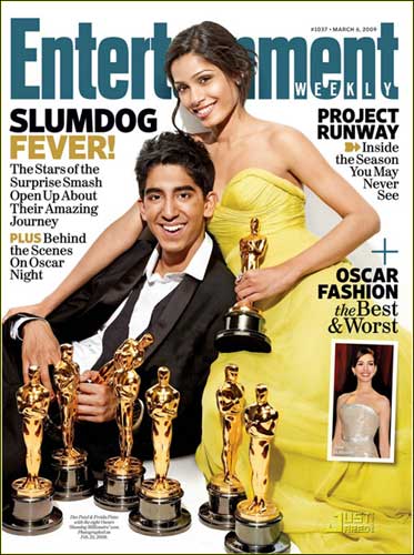 奧斯卡結束了,但是奧斯卡帶來風潮和效應并沒有結束,而橫掃奧斯卡的《貧民窟的百萬富翁》也捧紅了男女主角,他們等上了《Entertainment》雜志的封面,封面上兩個人眉開眼笑,手拿小金人拍照。