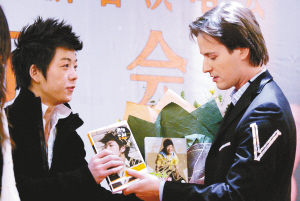 盡管場(chǎng)面沒有上次熱鬧,但是許多歌迷都是從上午接機(jī),一路趕到發(fā)布會(huì)現(xiàn)場(chǎng)。一位楊姓高三女生專門和母親一起從保定趕到北京,為的就是一睹Vitas的風(fēng)采。其母親告訴記者,自己非常支持女兒,甚至連自己也喜歡上了Vitas。曾以一曲《歌劇2》征服聽眾的快男王櫟鑫也來到現(xiàn)場(chǎng),把自己的唱片送給了Vitas。不過,當(dāng)主持人要求王櫟鑫飆一下高音時(shí)卻被王拒絕了。
