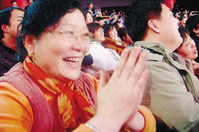 “‘裝’你們知道不?‘裝’在我們東北就是‘顯擺’的意思。你說我老師(指魏積安扮演的田教授)他多能裝呀!花5000塊錢買雙皮鞋,6000塊錢買塊手表,7000塊錢鑲口大金牙,然后一見我面就這樣:你看現(xiàn)在都8點(diǎn)了,我一會(huì)請(qǐng)你吃飯,你要不去我踢你……”這一段新加的臺(tái)詞配合著小沈陽夸張的齜牙咧嘴的動(dòng)作,把現(xiàn)場(chǎng)的觀眾都笑翻了。坐在記者身邊一位40多歲的大姐一連笑一邊捂肚子,記者問她是東北人嗎?能聽懂小沈陽的笑料嗎?大姐還滿臉的納悶:“這還用分哪兒地方的人嗎?誰聽誰不樂呀!”從昨日的現(xiàn)場(chǎng)來看,為了突出小沈陽的個(gè)人魅力,有長達(dá)一分半鐘的時(shí)間都是小沈陽一個(gè)人在舞臺(tái)上脫口秀,而這段臺(tái)詞的“笑”果確實(shí)不同凡響,引起的笑聲比其余7分鐘都多。