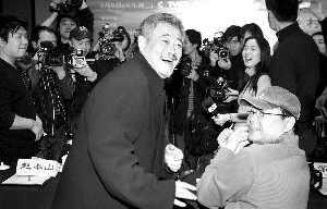也許是一直沒有在春晚彩排現(xiàn)場出現(xiàn),趙本山吊足了媒體記者的胃口,以至于在昨天的發(fā)布會現(xiàn)場,主創(chuàng)剛一合影結(jié)束,半秒鐘不到就圍上去二三十架機器,而且每一個麥克風都伸到趙本山前面不足5厘米的地方,別說采訪了,連對話都很難進行。