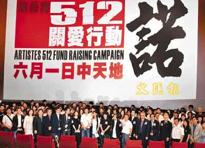 據(jù)香港文匯報(bào)報(bào)到,昨日近兩百余演藝界人士參加了記者會,短短十五分鐘談話便結(jié)束,會上先由活動召集人劉德華發(fā)言,他先為各界的支持致意,華仔又哽咽地說:“四川大地震發(fā)生,演藝界短短時(shí)間內(nèi)發(fā)起行動,大家勞心勞力,但這份熱情不是一時(shí)三刻,重建需時(shí)要三、五、七年,重建災(zāi)民的生活,是我們的承諾,我特別多謝中聯(lián)辦及香港電影發(fā)展基金于行動中的協(xié)助,以及西九龍中天地六月一日借出場地舉行賑災(zāi)大匯演,由于時(shí)間倉卒,不夠時(shí)間向有關(guān)政府部門申請,但深信活動會得到大家的響應(yīng)及支持,寄望天佑四川,天佑中國!