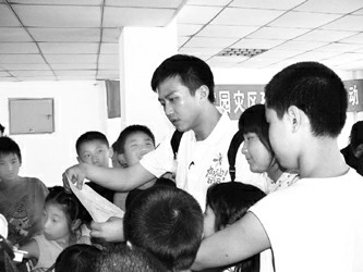 鄧超一來到武侯區(qū)愛心家園,馬上就被孩子們圍住了。鄧超問:“你們會唱什么歌?”幾十個孩子齊刷刷地響亮回答:“《感恩的心》!”當(dāng)孩子們不約而同地唱響此歌時,鄧超也跟著唱了起來,他懷里緊緊抱著一個孩子,眼里閃著淚花。來自映秀鎮(zhèn)的13歲女孩陳兆鮮昨天非常高興,因為鄧超帶著大家高聲朗讀了她寫下的幾句話:“我高興,因為我們得到了好心人的幫助!我快樂,因為暴風(fēng)雨過后又看到了美麗的彩虹……”