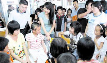 許飛給孩子們帶來(lái)了一大袋禮物,她還拿出自己的吉他,在病房里教小朋友演《祈禱》。(汪信)