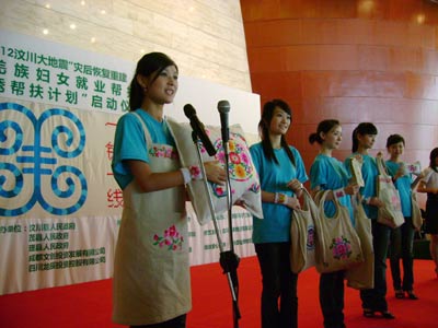 在稍后的一周時(shí)間內(nèi),5位中華小姐將前往羌民族世代聚居、同時(shí)也是受地震破壞嚴(yán)重的汶川、理縣、茂縣等地,與羌族婦女一起住帳篷、做刺繡,了解羌繡手工技藝、感受和記錄災(zāi)區(qū)同胞在災(zāi)后重建階段的生活狀況。5位華姐義工將在“壹基金”位于四川當(dāng)?shù)氐那祭C幫扶中心的培訓(xùn)指導(dǎo)下,了解羌繡的生產(chǎn)流程、參與產(chǎn)品的設(shè)計(jì)包裝,在進(jìn)行全面深入調(diào)研的基礎(chǔ)上集體完成羌繡幫扶報(bào)告并制定羌秀推廣計(jì)劃。5名華姐義工,有學(xué)習(xí)傳媒專業(yè)的,也有學(xué)習(xí)服裝設(shè)計(jì)專業(yè)的,我們會(huì)設(shè)計(jì)出有針對(duì)性和可行性的羌繡推廣方案,通過(guò)報(bào)紙、電視、網(wǎng)絡(luò)讓更多的人了解羌繡,同時(shí)也給羌繡手工藝品開(kāi)拓一片市場(chǎng),幫助受災(zāi)群眾盡快實(shí)現(xiàn)生產(chǎn)自救!