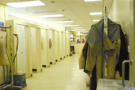 化妝室的盡頭連接著服裝間。走進(jìn)服裝間,記者發(fā)現(xiàn)里面還有一排更衣室。更衣室盡頭有一個(gè)柜臺(tái),兩旁放著掛滿衣服的推車。平時(shí)衣服的推送靠的就是這些不起眼的推車。服裝間外堆放著數(shù)個(gè)箱子,里面放著“時(shí)裝戒指”、“鉆石戒指”和“心口針”等人造首飾。據(jù)了解,TVB的演員,無論多大牌的明星,都是公用化妝間,只有兩個(gè)人有自己的化妝間,一個(gè)是汪明荃,一個(gè)是已經(jīng)永別的沈殿霞(肥肥)。