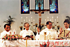 圖片說(shuō)明: 澳門(mén)教區(qū)大主教林家駿(右二)主持圣誕子夜彌撒。 |