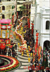 澳門十七日(農(nóng)歷年初二)舉行舞獅、舞龍賀新年活動。由百余人舞動的一百多米長金龍行過街道,慶賀新年到來。 |