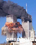 圖:美世貿(mào)中心被撞擊之后(資料圖片)
