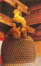 藏經(jīng)閣位于寺院的最后一進院落。上下兩層,均為東西面闊五間,南北進深三間。外觀呈現(xiàn)朱紅色,青灰色的殿頂。檐枋等施以花卉人物故事為題材的精美彩繪。閣東西兩側(cè)有朱紅小樓,扶廓將小樓與主樓邊接成一體,使建筑顯得格外緊湊別致。