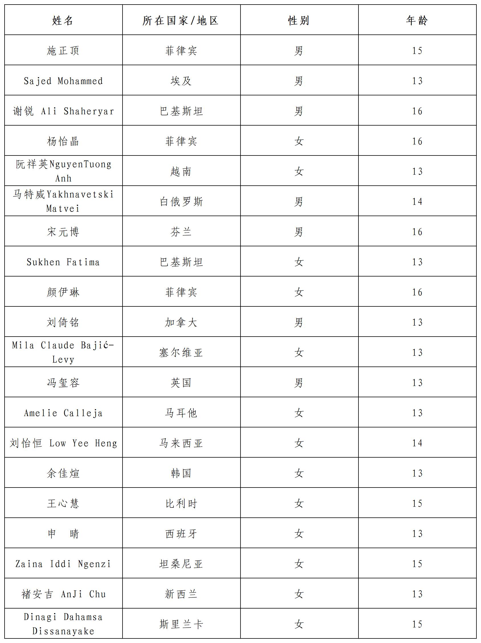 公示時間:即日起至2022年2月1日北京時間24:00 咨詢方式: 郵箱:yszxhd@sclc2017.org 聯(lián)系電話:15810563423 如有異議,請于公示期間致電或郵件咨詢。本活動最終解釋權(quán)歸中國宋慶齡青少年科技文化交流中心所有。 備注:標(biāo)注國家以參與者報名時駐在國為準(zhǔn)。